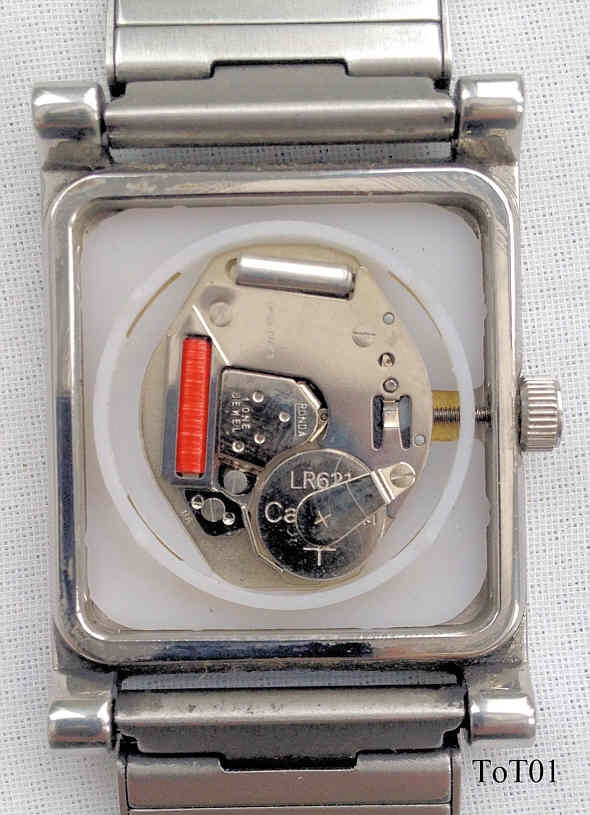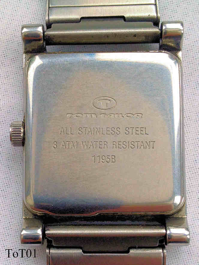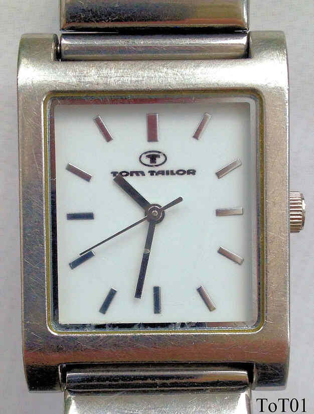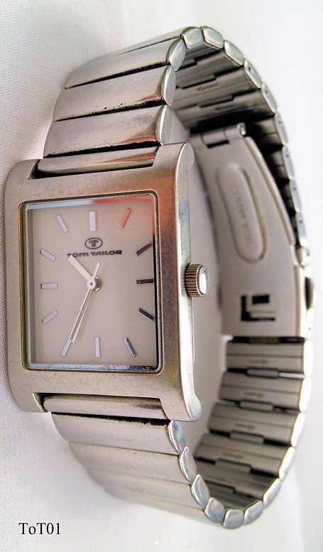 Eine Edelstahl Herrenuhr von Tom Tailor. Einfach designed, weißes Zifferblatt mit Zahlenbalken in Silber. Beschriftet vorn: “Tom Tailor”, hinten: “Tom Tailor, All Stainless Steel, 3 ATM Water Resistant, 1195B”, innen: “Ronda, 1 one Jewel, DA “. Edelstahl Band mit Druckschließe, einfaches Ronda Kaliber DA.