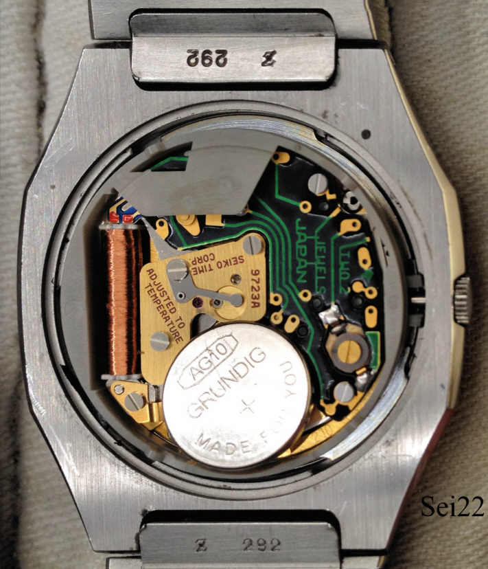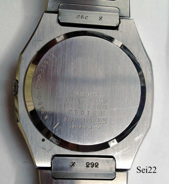 Dies ist eine Edelstahl Herrenuhr mit sehr schönem blauen Zifferblatt. Day Date, Beschriftung vorn: “ Twin Quartz, Seiko, SQ”, innen: “Seiko Time Corp., adjusted to temperature, 9723A, two (2) Jewels. Japan”, hinten: ”Seiko, Water Resistant, Stainless Steel, 050168, 9723- 8000, 61, Japan”,€ mit Stahlboden und Edelstahl Gliederarmband, auf dem Armband die Nummer 292, Bajonettverschluß der Rückwand. Diese Uhr hat zwei Quartz Kristalle, wobei einer für die Temperaturcompensation verantwortlich ist. Maximale Gangabweichung 5 sec. pro Jahr. Produktionsjahr 1979