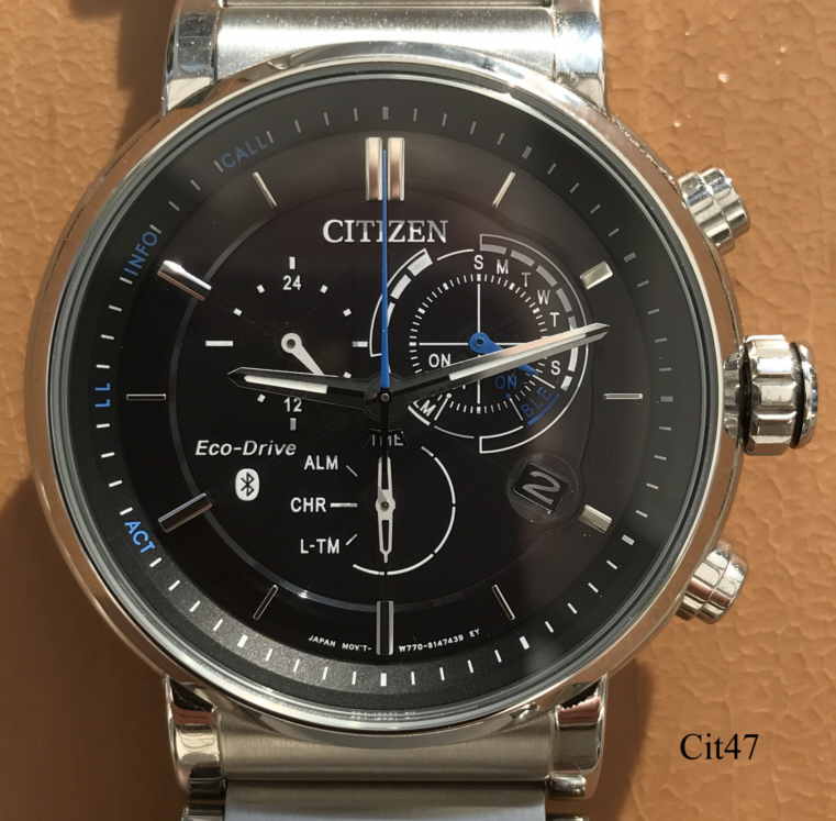 Eine Citizen Eco-Drive Bluetooth Smartwatch, koppelt mit iOS und Android Telefonen und überträgt Signale vom Handy auf die Uhr Kaliber Citizen W770MV, mit Analoganzeige, Beschriftung vorn: “Citizen, Eco-Drive, Japan Movt. W770- S147439 EY“, hinten: “ Citizen Watch Co.,W.R. 10 Bar, GN-4-WS, Japan Mov’t.,601020176, W770-S108837, St.Steel Citizen ECO Drive, Bluetooth, div. Funkzeichen”, innen: “Citizen Watch Co., No Jewels, Model W770MV, IC 5278B-W770MV”. Edelstahl Armband mit Schmetterlingsschließe. Die Stromversorgung erfolgt als Eco-Drive über Solarzelle im Zifferblatt und Accu.