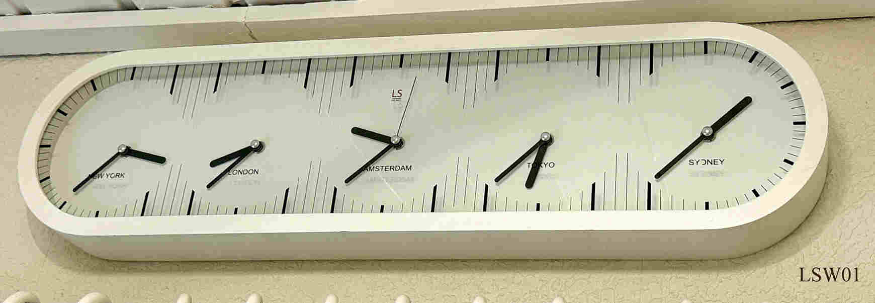 Dies ist eine Weltzeituhr wie sie in Hotels oder anderen öffentlichen Gebäuden gezeigt wird. Gezeigt wird die Zeit von New York, London, Amsterdam, Tokyo und Sydney. Ursprünglich bestückt mit 5 einfachen Quartzwerken, wobei nach relativ kurzer Zeit die Minutenzeiger nicht mehr synchronisiert laufen. Deshalb habe ich die Uhrwerke gegen Funkuhrwerke ausgetauscht. Speziell angefertigtes Holzgehäuse mit abnehmberer Rückwand zum Batteriewechsel.