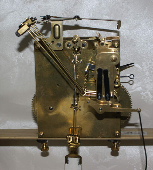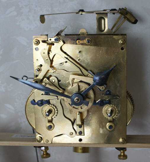 This is a beautiful Wallclock with a 3/4 Westminster Gong. The clock is a heritage from my Grandfather, where it dominated the living room. Every 1/4 hour a tone sequence is played, on the hour the time was announced by a triad in the number of the hour. A very nice movement in brass with a sophisticated gong mechanism. Via a drum the Westminster gong is played and via a chain bar the hours are played. The clock was produced around 1910, strill working. The wooden cabinet was originally stained in black.