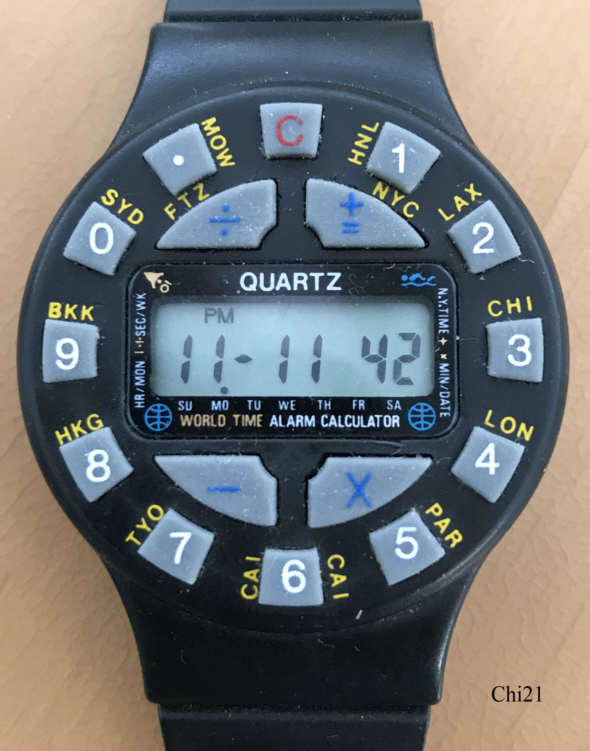 Eine Uhr unbekannter Herkunft mit Weltzeit, Wecker und Rechner. Beschriftet vorn: ”World Time Alarm Calculator”, hinten: “ ”, innen: “ST947”. Funktionen: Datum, Uhrzeit, Weltzeit, Rechner. Kunststoff Gehäuse mit Kautschuk Armband.
