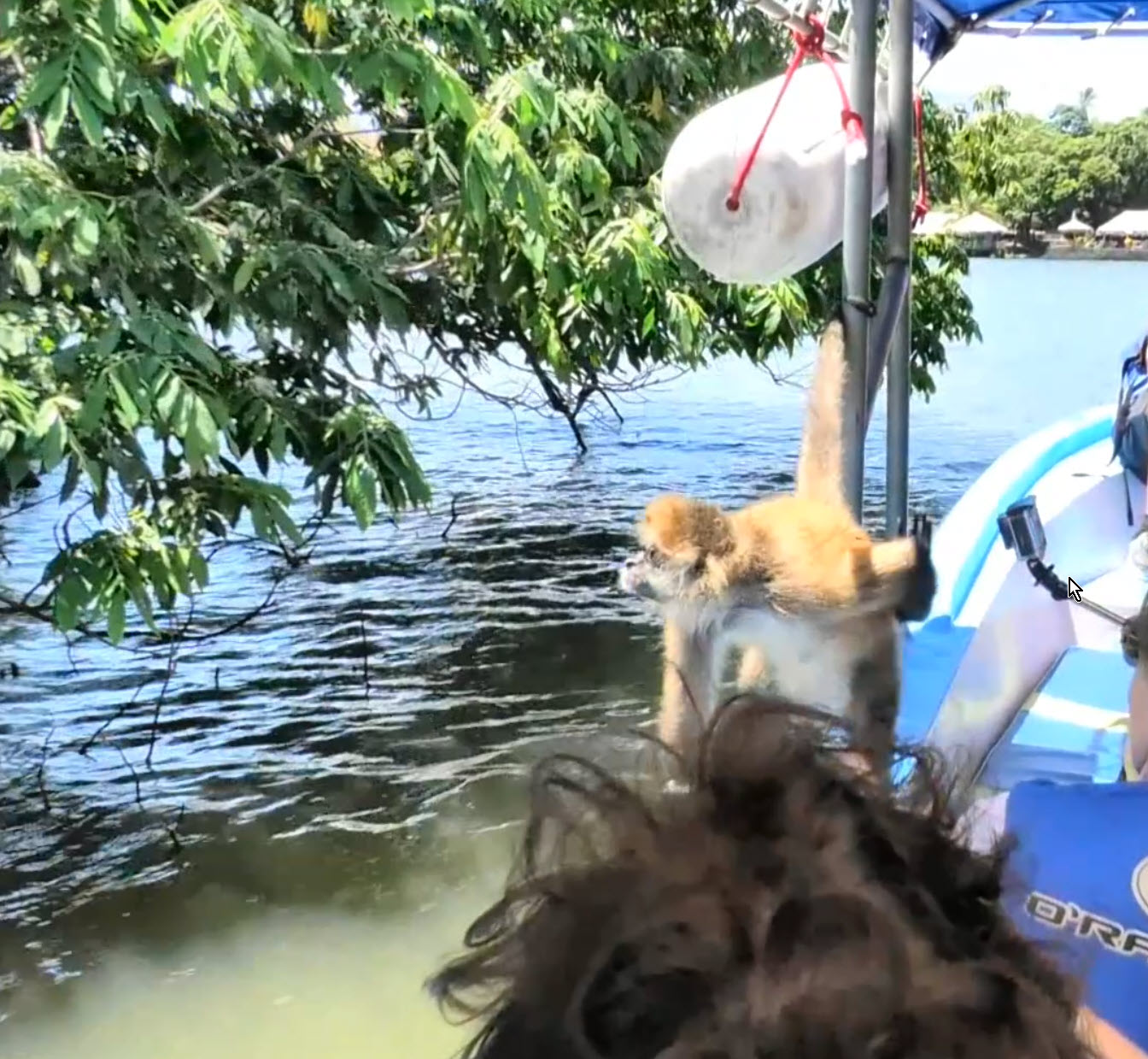 14.03.2019 Busfahrt rund um den See und weiter durch Bananenplantagen zurück nach Costa Rica. Unterwegs Mittag in einem Rasthaus mit Riesen Waranen auf den Bäumen vorm Fenster