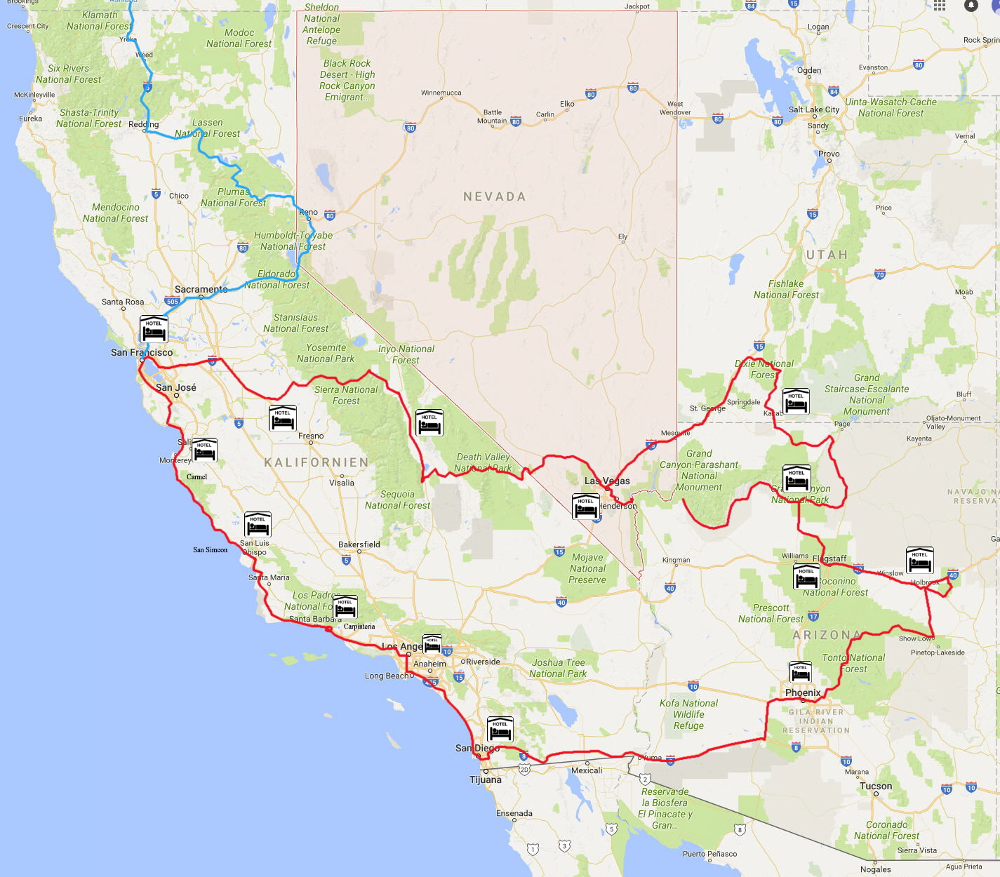 02.09. - 30.09.1982 USA Reise mit Heike und Hans-Gerd nach Los Angeles, San Diego, Phoenix, Holbrook, Grand Canyon, Kanab, vier Tage Las Vegas, hier haben Heike und Hans-Gerd geheiratet, Bishop, Merced, vier Tage in San Francisco, Santa Cruz, Carmel, drei Tage San Simeon, drei Tage Carpinteria, zurück nach Los Angeles, Rückflug nach Hamburg. Insgesamt 6617 Km