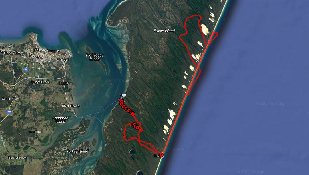22.10.2017 Ganztägiger Ausflug mit einem Allrad Bus durch die Sandinsel, sehr eindrucksvoll! Das Wetter ist entgegen aller Erwartungen sehr gut. Wir sehen den McKenzie See, den Wanggoolba Creek im Regenwald, Fahrt über den Strand und Rundflug mit dem Flugzeug, Eli Creek und Maheno Schiffswrack schließen den Tag ab.