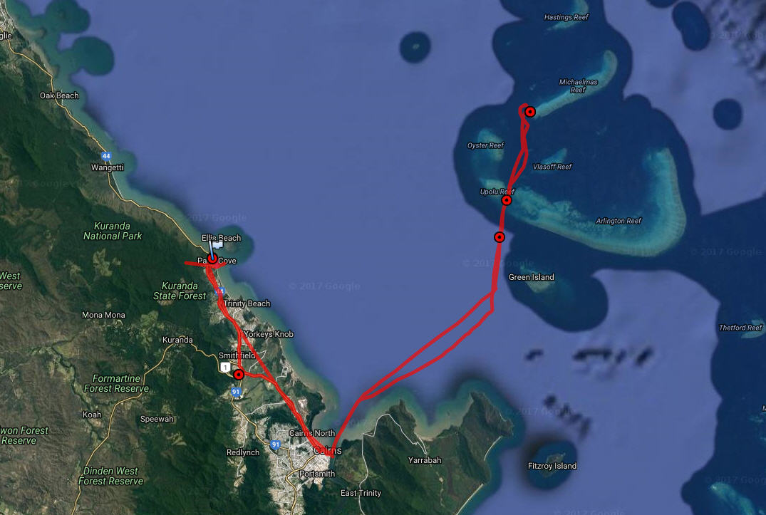 20.10.2017 Tagesausflug mit dem Catamaran nach Michelmas Kay, eine triste Sandbank, zu 80% gesperrt wegen Vogelschutzgebiet. Dort Möglichkeit zum Schnorcheln und Tauchen, Anschließend eine 15 Minütige (!) Fahrt mit einem “Unterseeboot” zur Korallenbeobachtung. Leider gibt es nichts zu sehen und das Boot schrammt sehr dicht mit Berührungen an den Korallen vorbei, soviel zum UNESCO Welt Naturerbe. Sehen konnte man fast nichts, da das Boot keinerlei optische Hilfen wie Scheinwerfer etc. hat. Leider insgesamt eine traurige Vorstellung.