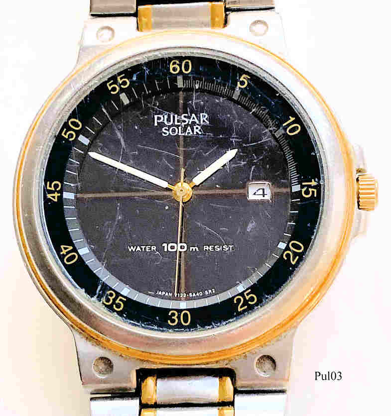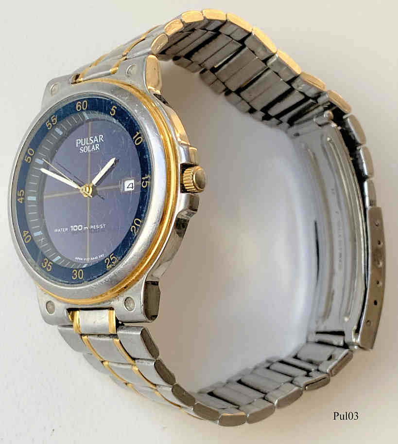 Dies ist eine Pulsar Solar Uhr mit Base Metal Gehäuse. Das Zifferblatt ist schwarz mit Datumsfenstern. Auf die Solarelemente ist ein Ring mit Minuteneinteilung aufgesetzt, das Gehäuse ist Base Metal. Beschriftet:”Pulsar, Solar, Water 100 M Resistant, Japan V122-6A40-SR2 ” Rückseite:” Nickel Free, PULSAR,Anti-Mag. 4800 A/m, Water Resistant 10 Bar, Base Metal Bezel, Stainless Steel Back, V122 6A40 A0, 4N0078”