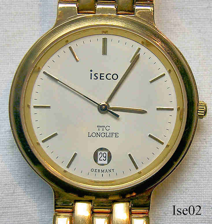 Eine Iseco Uhr mit klarem weißen Zifferblatt, Datum bei der 6. Beschriftet vorn: ”Iseco, TTC, Longlife, Germany”, hinten: “Stainless Steel Back, Water resistant 3 ATM, TTC Longlife”, innen: “Swiss, Harley, Ronda SA:, Five 5 Jewels, DAD”. Longlife bezieht sich auf die Lithium Jod Batterie, die die Uhr 20 Jahre Garantiert antreiben soll. Die ganze Rückwand ist die Batterie. Kaliber Harley Ronda DAD
