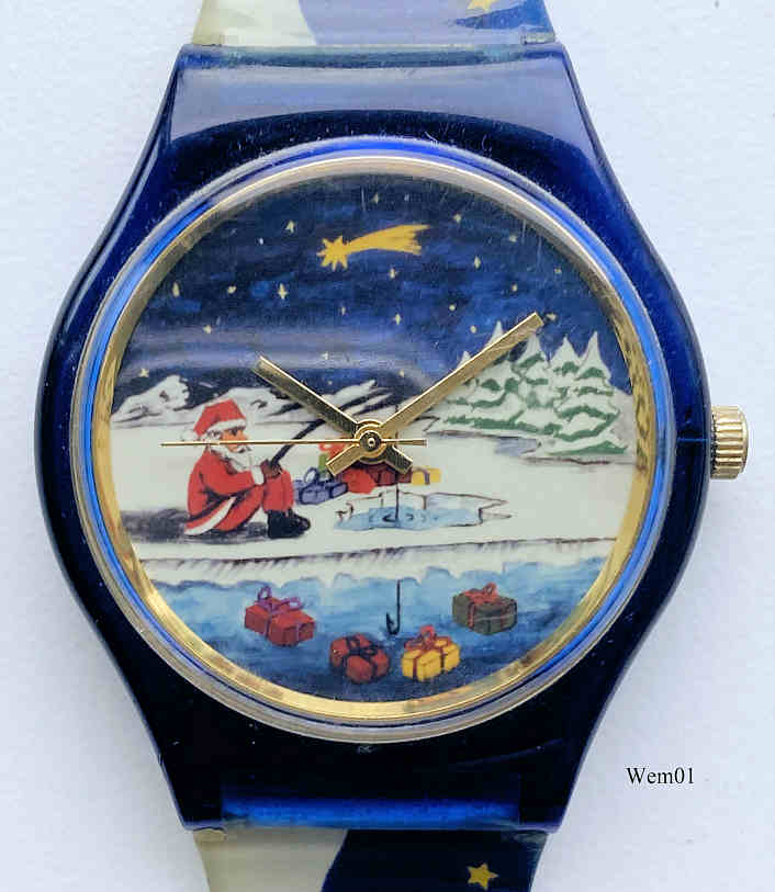 Dies ist die Wempe Weihnachtsuhr 1994, herausgegeben vom Juwelier und Uhrmacher Wempe. Beschriftet vorn: Weihnachtsmotiv hinten: ”Stainless Steel Back, exclusiv, für, Wempe, Weihnachten, 1994, Water Resistant 3 ATM”, innen :”unadjusted, Miyota Co., 280-39, Japan, one 1 Jewel, Unadjusted”. Caliber Miyota 280-39