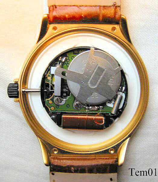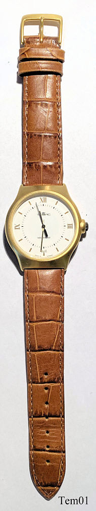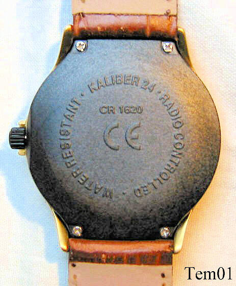 Dies ist eine Herren Funkuhr von Tempic mit römischen Ziffern auf dem weißen Zifferblatt. Die Uhr synchronisiert sich mit dem DCF77 Sender und stellt alle relevanten Daten nach. Das Uhrwerk ist ein Quartzwerk von Ronda, die Empfängerplatine wurde in Ruhla entwickelt und gebaut. Beschriftet vorn: ”Tempic, Radio Controlled”, hinten: ”Kaliber 24, Radio Controlled, Waterresistant, CR1620, CE”, innen: ”HK1051A, MA342”