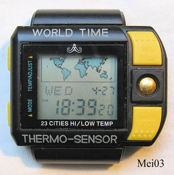 Eine Digitaluhr von Meister Anker mit integrierter World Time und Thermometer Funktion. Folgende Funktionen sind eingebaut: Uhrzeit / Wochentag / Datum (Foto), World Time für 23 Städte mit Hi/ Lo Temparatur, Alarm, Stoppuhr. Beschriftet vorn: ”World Time, Thermo Sensor, 23 Cities HI / LO Temp” , hinten: ”Meister Anker, 369091 4/09, Stainless Steel Caseback”, innen: “F0067”. LCD Anzeige mit Weltkarte und Zeitzonen Anzeige, Thermo Sensor, Kunststoff Gehäuse. |
