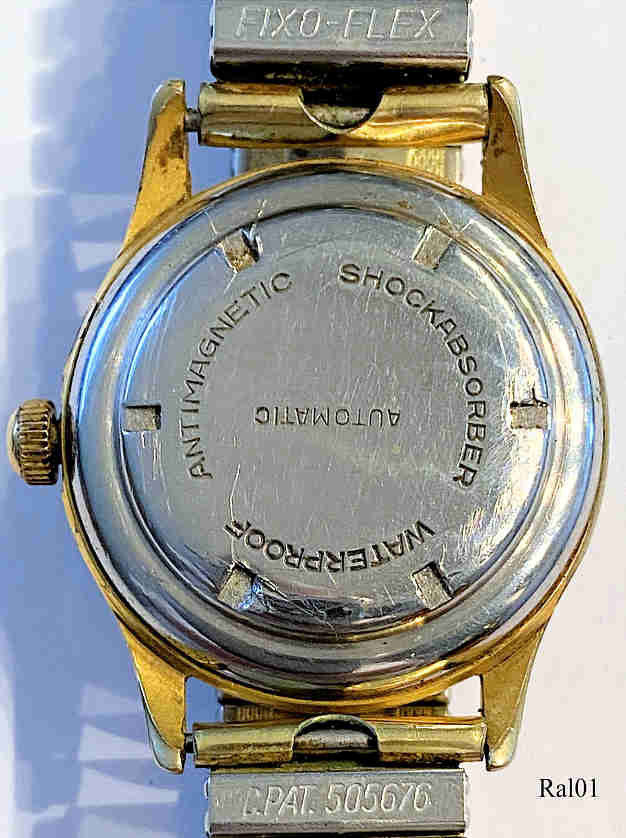"Ralco" Uhren werden von Movado hergestellt, der Name besteht aus den ersten Buchstaben von drei Mtgliedern der Ditesheim Familie, Roger, Armand and Lucien (Eigentümer von Movado). Eine RALCO Automatic Uhr mit einem frühen Hammerautomatic Werk. Hier ist das Automatic Gewicht nicht als Rotor ausgeführt sondern als Schwinge, die Hin und Her schwingt. Beim Linksschwung wird das Zahnrad zum Aufziehen mitgenommen, beim Zurückschwingen ratscht der Mitnehmer über. Beschriftet vorn: “RALCO, Swiss Made”, hinten: ”Waterproof, Antimagnetic, Shockabsorber, Automatic”, innen: ”RALCO, Swiss Made,15 Jewels”, im Boden: “Stainless Steel, Back, 523076”.