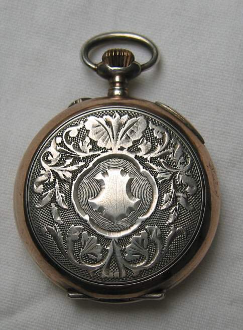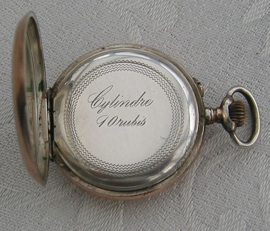 Eine Damen Taschenuhr mit unbekannter Marke, Gehäuse Kupferfarben und silber. Porcellan Zifferblatt, schön zieslierte Zeiger. Beschriftet: im außen Deckel:”Cylindre”, im innen Deckel:”155092, K&L, 8 “