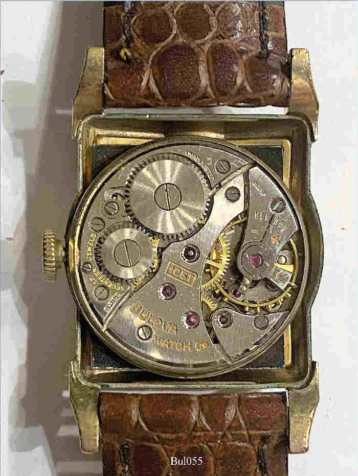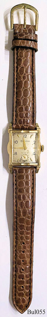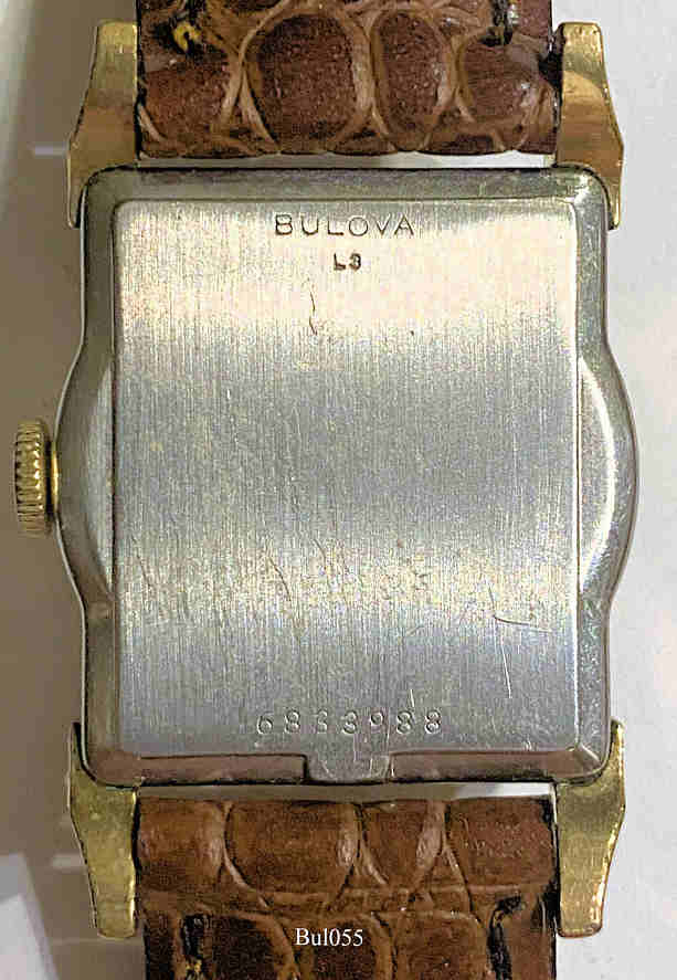Eine Bulova Handaufzugsuhr mit vergoldetem Gehäuse, Modell “Ambassador”, Beschriftet vorn: “Bulova” hinten: “Bulova, L3, 6838988”, innen: ”Bulova Watch Co, 10BT, seventeen 17 jewels, unadjusted” Caliber 10BT, Herstelldatum 1953 (L3), geklemmter Edelstahl- Boden, Hellbraunes, handgearbeitetes Lederarmband. Modell Ambassador