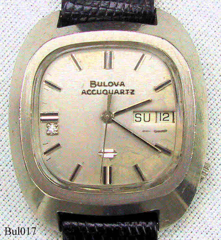 Eine Accuquartz von Bulova mit dem für die Accuquartz typischen “Brillianten” und dem Quartz Symbol auf dem Zifferblatt, Beschriftet vorn: ”Bulova, Accuquartz”, hinten: ”Bulova, Stainless Steel Case, Water Resistant, N9, T001433”, innen: “Bulova Watch Co., 2783.10”, Herstelldatum 1979 (N9), Caliber 2783.10, Tag und Datum bei 3. Caravelle Eidechs-Lederarmband mit neutraler Schließe.
