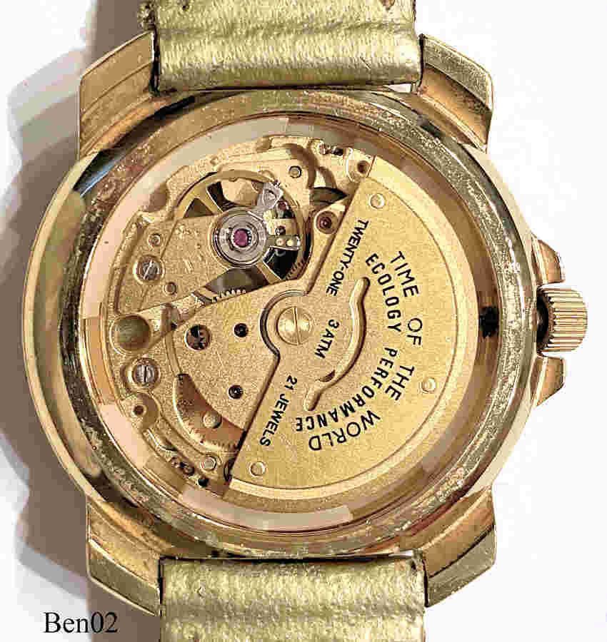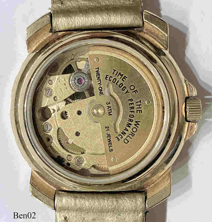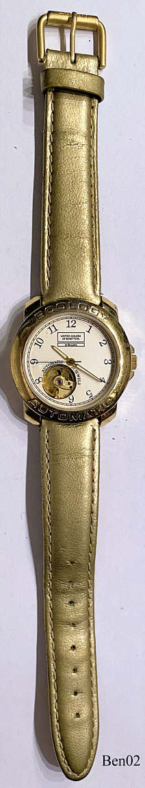 Eine sehr schöne Automatic Uhr mit sichtbarer Unruhe und Glasboden. Beschriftet vorn: ”United Colors of Benetton, by Bulova, Automatic, 21 Jewels”, auf dem Gehäuserand: ”Ecology, Automatic”, hinten: ”The time of the world, Ecology Performance, twentyone 21 Jewels 5 ATM”. Goldenes ESPRIT Lederarmband mit Esprit Schließe.