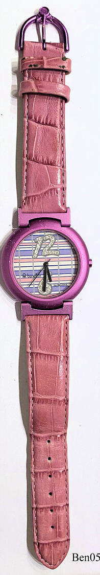 Benetton by Bulova in crazy pink, signed front:”Benetton by Bulova” back:”Benetton by Bulova, Stainless Steel Back, Water Resistant, 3 ATM, Base Metal Bezel”, pink textile strap with Benetton clasp.