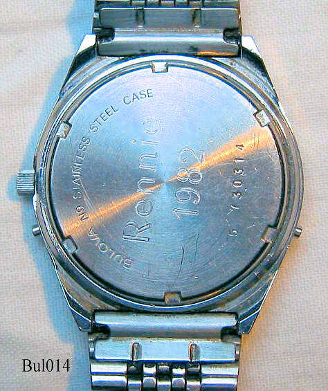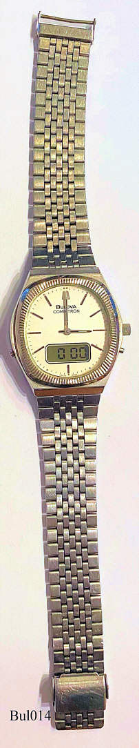 Bulova Combitron, a combination of a digital and an analog quartz watch. Signed front: “Bulova Combitron”, back: “Bulova, N9, Stainless Steel Case, 5 730314, engraved: Rennie 1982”, inside: “Bulova 2576.10, Cell 242, unadjusted, seven (7) Jewels, Swiss made, Y2 , 200231”, LCD switchable from time to stopwatch. Stainless Steel band with neutral clasp, date of manufacture 1979 (N9).