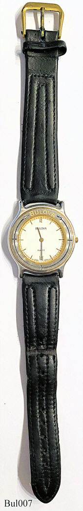 Eine Bulova Quartz mit weißem Zifferblatt,Datum bei der “6”. Beschriftet vorne: ”Bulova, Quartz”, hinten: “Water Resistant, Swiss Made, Stainless Steel, 2.199.0.0.80, 648016” innen: ”BULOVA”. Kein Datumscode
