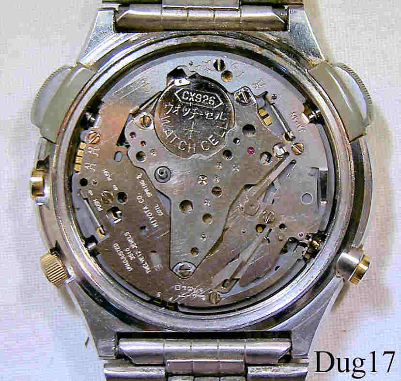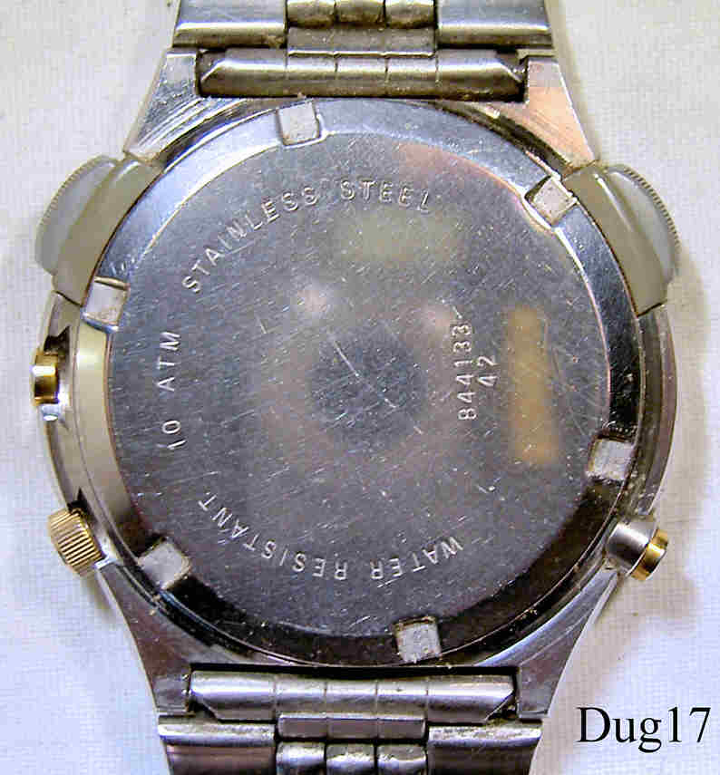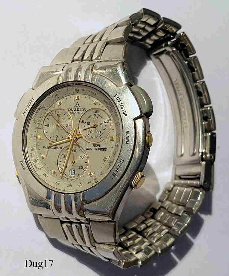 Ein Dugena Chronograph mit Edelstahl Gehäuse und Edelstahl Boden. Kaliber Miyota 3S10, Datum bei der 6, Beschriftung vorn: “Dugena, Quartz, Alarm Chronograph, 100 M, Wasser Dicht”, hinten: ”Water Resistant, 10 ATM, Stainless Steel, 844133, 42”, innen: “Unadjusted, 3S10, twelve 12 Jewels, Miyota Co.” Dugena Edelstahl Armband mit Dugena Schließe.