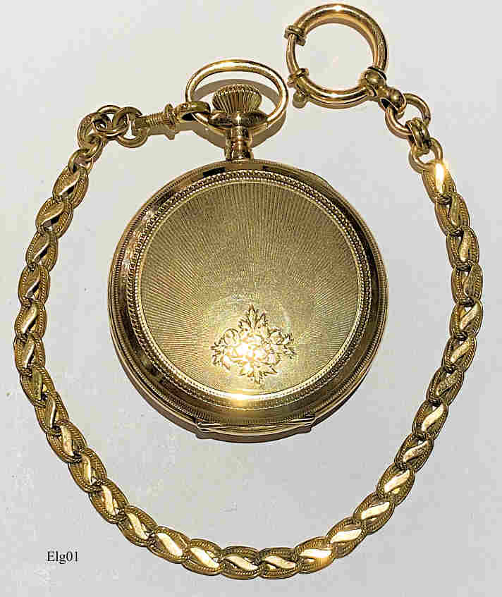 Eine Elgin Taschenuhr mit vergoldetem Gehäuse und dazu passender Uhrenkette. Dies war die “gute” Uhr meines Großvaters, der sie während seiner Fahrenszeit von Amerika mitgebracht hatte. Beschriftet vorn: “Elgin”, innen: “Elgin Nat’l. Watch Co., 12569516, Seven Jewels, Safety Pinion, USA”, im Deckel innen: ”7664608”. Es handelt sich hier um ein Model 6, Grade 151, Herstellung ca. 1898