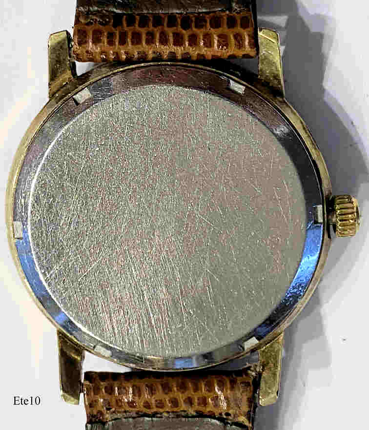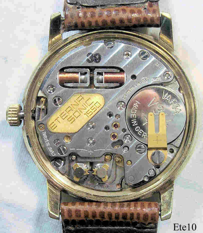 This is an Eterna Sonic with gold plated case in a very slim design, date at 4. The movement is an Eterna 1550 (ETA 9162 ), signed front: ”ETERNA, Sonic, Electronic”, back:”Water Resistant, 5531641”, inside: ”ETERNA WATCH Co, 1550, Unadjusted, 12 Jewels”. The watch has a brown, lizard shaped strap.