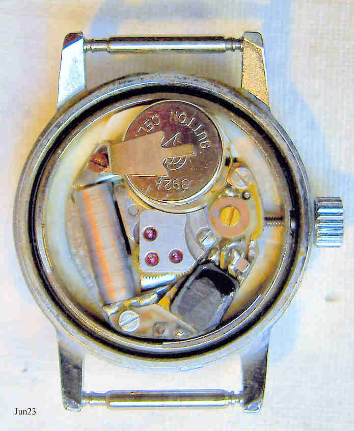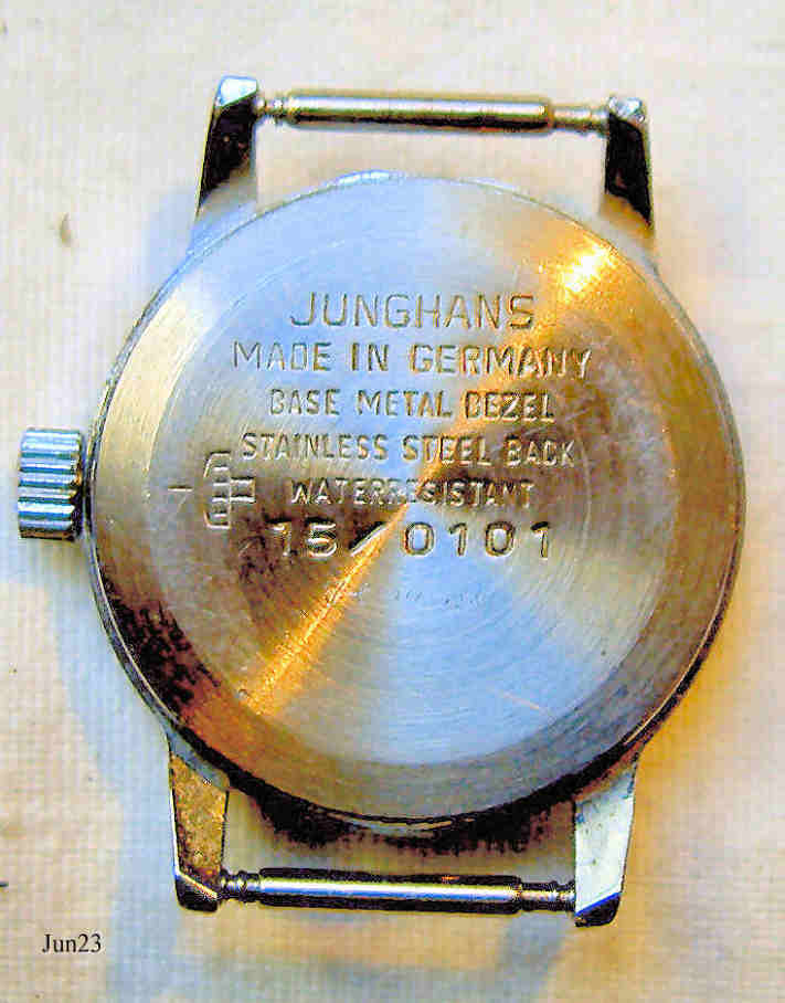 A Junghans Quartz ladies watch in a stainless steel case, Caliber 642.50. Signed front: ”JUNGHANS, Quartz, Germany”, back: ”Junghans, Made in Germany, Base Metal Bezel, Stainless Steel Back, Water Resistant, 15 / 0101”, inside: ”642.50, (5) Five Jewels, Germany, Unadjusted”.
