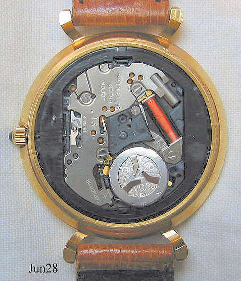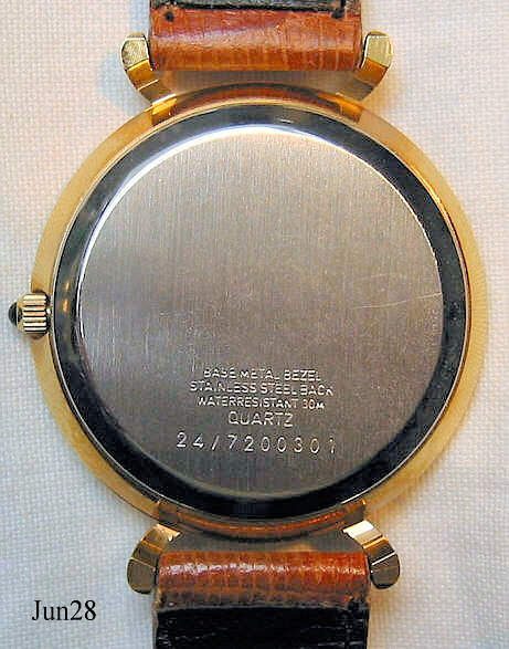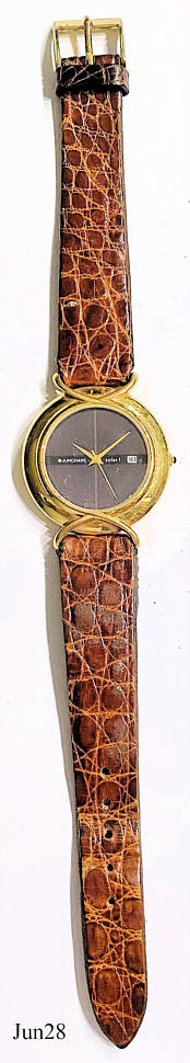 A Junghans Solar watch with Calendar at 3, black gem in the crown and very beautiful lugs. The dial is a big solar cell, generating electric power through sunlight and accumulating it in a Capacitor. This capacitor then drives a normal quartz movement, here a Shiojiri V122A. Signed front:” Junghans Solar 1”, back:” Base Metal Bezel, Stainless Steel Back, Water Resistant 30m, QUARTZ, 24-7200301”, inside: “Japan, V122A, Shiojiri Ltd., One 1 Jewel, Unadjusted”.  Brown leather band.