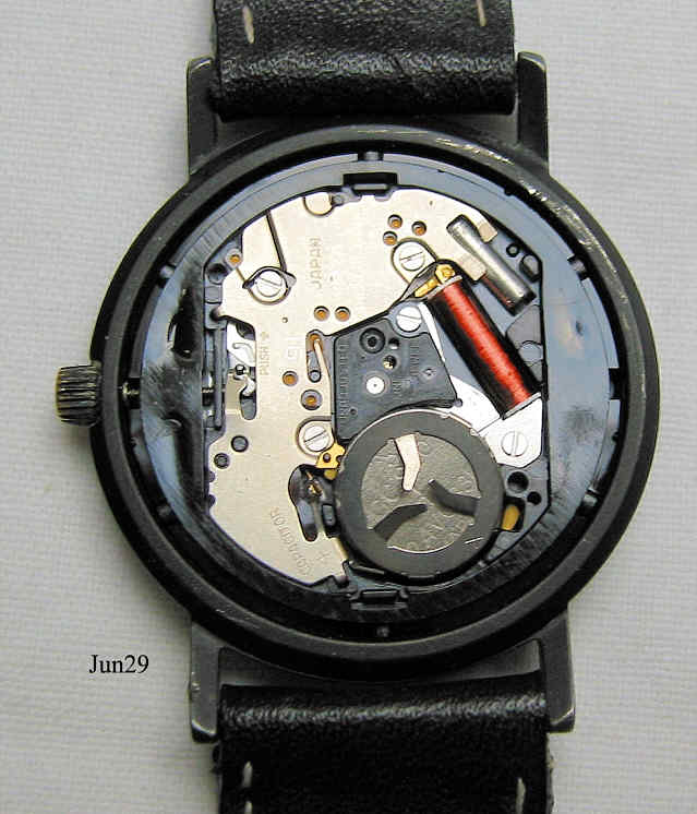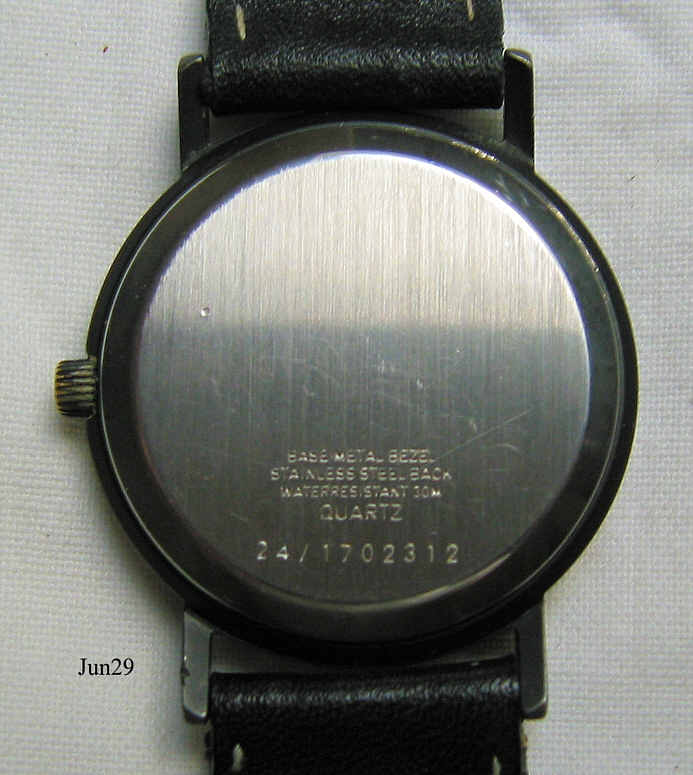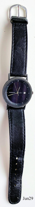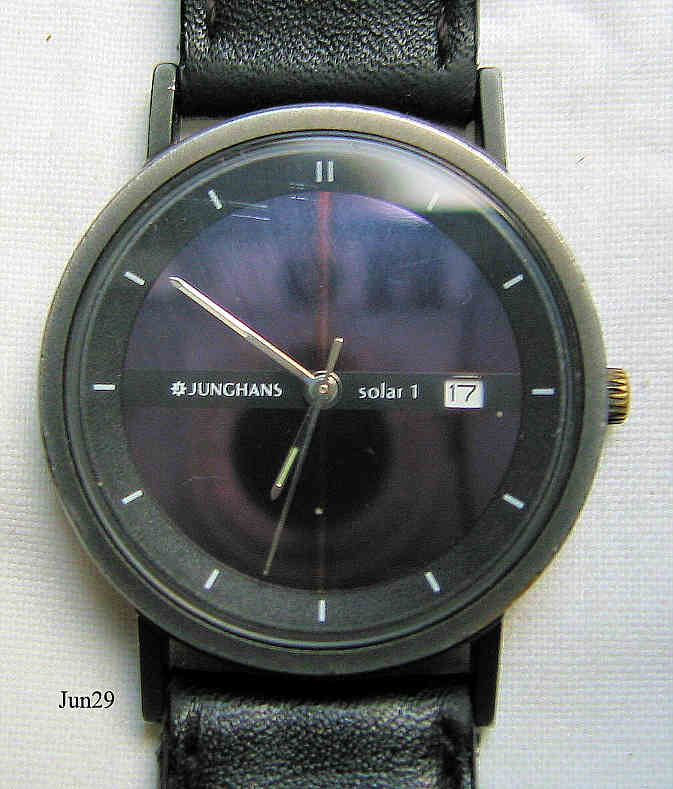 Eine Junghans Solar Armbanduhr mit Kalender bei der drei. Das Zifferblatt ist eine große Solarzelle, die bei Sonnen Einstrahlung Strom erzeugt und in einem Kondensator speichert. Dieser Kondensator treibt dann eine  normale Quartz Uhr an. Inschrift vorn: ”Junghans Solar 1”, hinten: ”Base Metal Bezel, Stainless Steel Back, Water Resistant 30m, QUARTZ, 24-1702312”, innen: “Japan, Unadjusted, One 1 Jewel”. Schwarzes Lederarmband, Kaliber Shiojiri V122A.