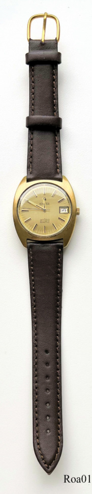 Eine Roamer AnfibioMatic Uhr mit Roamer MST 522 Werk. Base Metal Gehäuse mit braunem Lederarmband. Beschriftet vorn:” Roamer, Anfibio, Matic”, hinten:” Stainless Steel Back, MOD. 522-1230 016”, innen:” Roamer, Seventeen Jewels, Roamer Watch Co., MST 522”. Date bei der 3. Caliber Roamer MST 522.