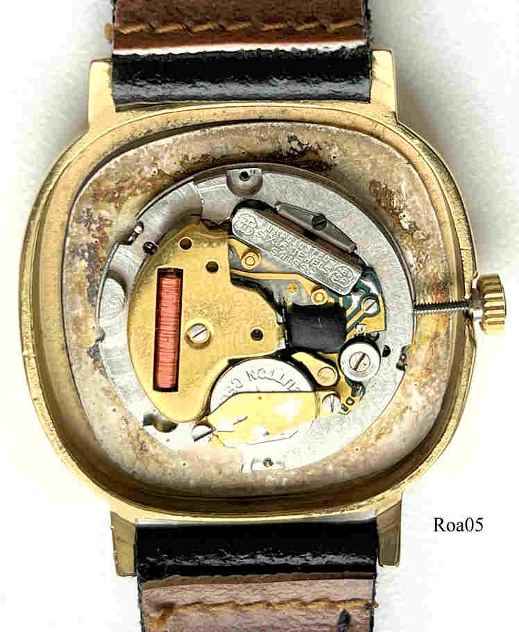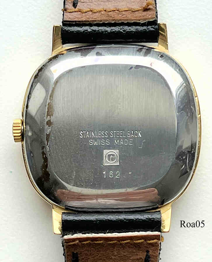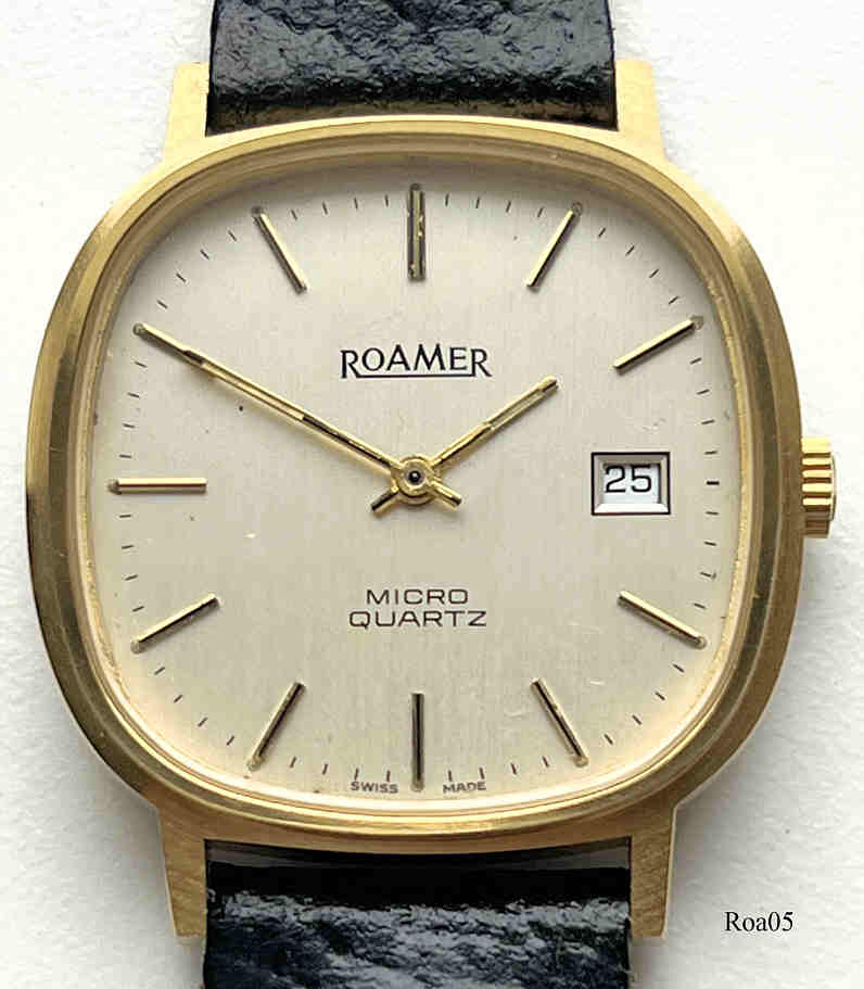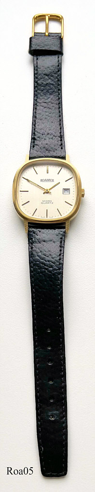 Eine Roamer Micro Quartz in vergoldetem Gehäuse mit schwarzem Lederarmband. Beschriftet vorn:”Roamer, Micro, Quartz”, hinten:”Stainless Steel Back, Swiss Made, 162”, innen:” Unadjusted, Six 6 Jewels, Swiss”. Kaliber ESA 935.312. Creme farbenes Zifferblatt mit Datum bei der 3.