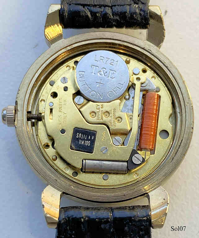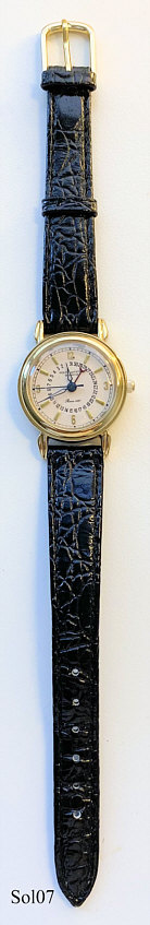 Dies ist eine Solvil & Titus Damen Quartzuhr im goldfarbenen Gehäuse und schwarzem Lederarmband. Beschriftung: ”Solvil et Titus, Quartz, Roma 1887”, hinten: ”Solvil et Titus Stainless Steel Back, 49-8303-24, 015086“, innen: “Swiss Parts, Assbly HK, Harley Ronda SA, One Jewel, Unadjusted, 784”. Base Metal Gehäuse mit Edelstahl Boden. Der Zeiger mit dem roten Halbmond zeigt das Datum. Harley Ronda 784 Kaliber.