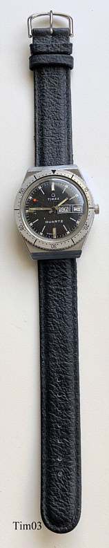 Dies ist eine Timex Quartz Taucheruhr mit Tag und Datum. Beschriftet: ”Q, Timex, Quartz, Taiwan”. Auf der Rückseite : Water Resistant, Chrome Plated Base Metal Bezel, Stainless Steel Back, Assembled in Taiwan”. Innen: ”Electronic, 2 Jewels Unadjusted”. Der Quartz stabilisiert die Unruhe, die konventionell die Zeiger antreibt.