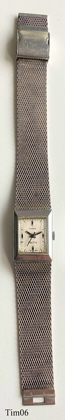Dies ist eine Damen Timex electric, eine der ersten elektrischen Armbanduhren, bei denen die Batterie nur die Aufzugsfeder ersetzt. Die Unruhe wird über eine elektrisch angesteuerte Spule in ein Magnetfeld gezogen, über Kontakte wird der Stromkreis unterbrochen, die Unruhe schwingt zurück, der Stromkreis wird wieder geschlossen......Die Uhr hat ein schönes Gehäuse mit integriertem Milanaiseband. Bezeichnet vorn: “Timex, Eectric, Tai Wan”, hinten: “Base Metal Bezel, Stainless Steel Back”, innen: “Timex, Taiwan, Four 4 Jewels, Unadjusted, 168”.