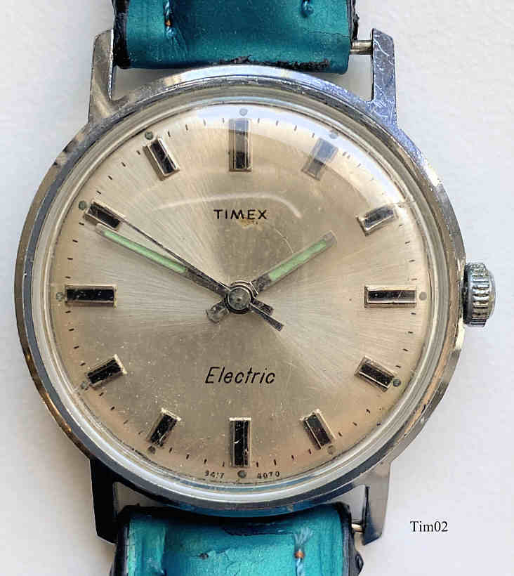 Dies ist eine Timex electric, eine der frühen elektrischen Armbanduhren, bei denen die Batterie nur die Aufzugsfeder ersetzt. Die Unruhe wird über eine elektrisch angesteuerte Spule in ein Magnetfeld gezogen, über Kontakte wird der Stromkreis unterbrochen, die Unruhe schwingt zurück, der Stromkreis wird wieder geschlossen......Die Uhr hat ein sehr einfaches Gehäuse, wie bei Timex üblich.Beschriftet vorn: “Timex, Electric, 9417, 4070”, hinten: “Timex, Water Resistant, Chr. Pl. Base Metal Bezel, Stainless Steel Back”, innen: “201”. Timex Kaliber M40
