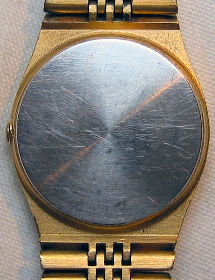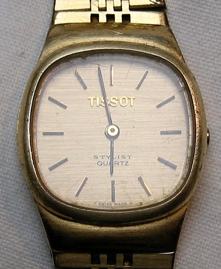 Gehäuse vergoldet. Beschriftet vorn:”Tissot, Stylist, Quartz”, innen:”Tissot, 20956, 2032, SSH, unadjusted, two (2) Jewels, Swiss” keine Beschriftung auf der Rückseite. Diese Uhr hat keine Krone, gestellt wird über einen Druckknopf und den Steppermotor.