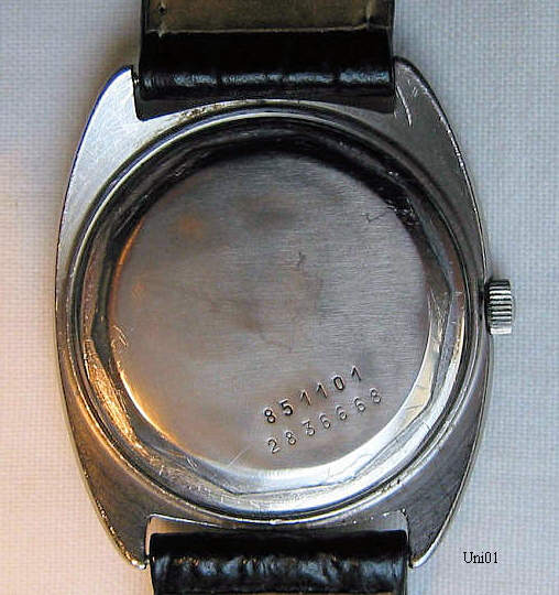 Dies ist eine Universal Genève Unisonic, neben der Citizen Hisonic die einzige Stimmgabeluhr mit dem Bulova 2180 Werk. Werk N° 2’836’668, Universal Caliber 1-51, Referenz Nr.: 851101, Beschriftet vorn: ”Universal Geneve, Unisonic, -Swiss Made - T”, hinten: “851101, 2836668”, innen: ”15 Fifteen Jewels, 1-51, Universal Geneve, unadjusted”