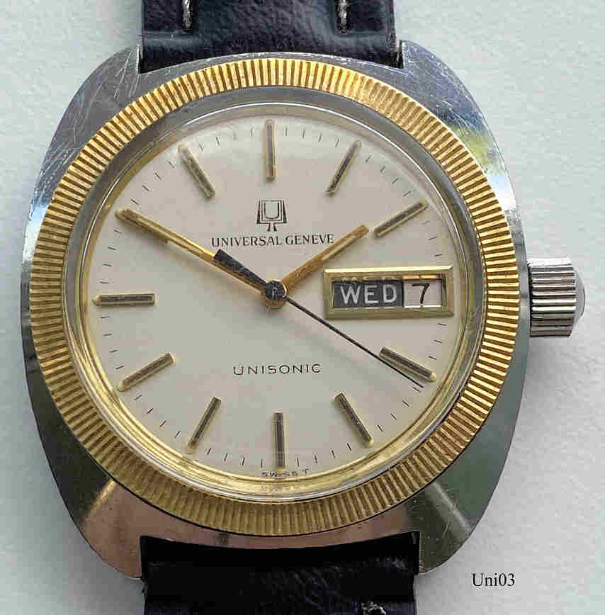 A Universal Genève Unisonic, neben der Citizen Hisonic die einzige Stimmgabeluhr mit dem Bulova 2182 Werk. Werk N° 2’660’584, Universal Caliber 1-53, Reference Nr.: 853 102/01, Signed front:” Universal Geneve, Unisonic, Swiss T”, back: ”14K gold Bezel, Stainless Steel , 853 102/01, 2’660’584”, inside:” 15 Fifteen Jewels, 1-53, Universal Geneve, unadjusted”, Day / Date at 3.
