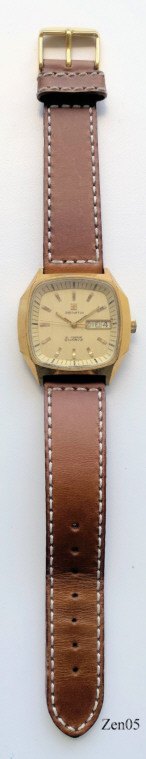 Eine Zenith Quartz Uhr mit Certina 29-262 Werk, Aufschrift vorn:”Zenith, XL-Tronic, Quartz”, innen:” Certina, 29-262, seven 7 Jewels, Swiss”, hinten:” Surf Stainless Steel Back, Gold Electroplated Bezel, 20-0020-515”. Braunes handgenähtes Lederarmband