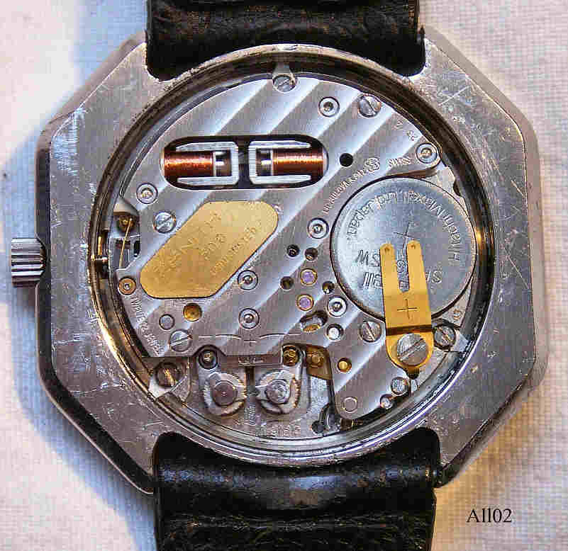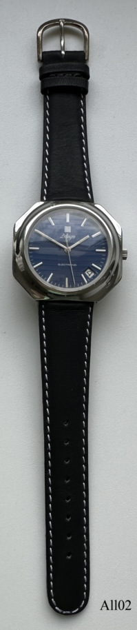 Dies ist eine Allegro Electronic Stimmgabeluhr mit Kalender in achteckigem Edelstahlgehäuse, ESA 9162, mit schwarzem Lederarmband . Beschriftet: “Allegro Electronic”, Rückseite: ”Surf Stainless Steel, 01-0040-500” innen: ”Zenith, 50.0, unadjusted, twelve 12 Jewels, Lic.Bulova + Pat. ESA”.