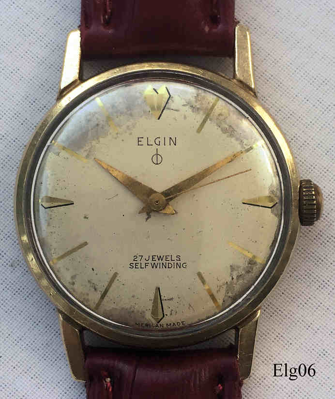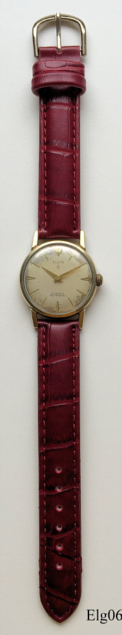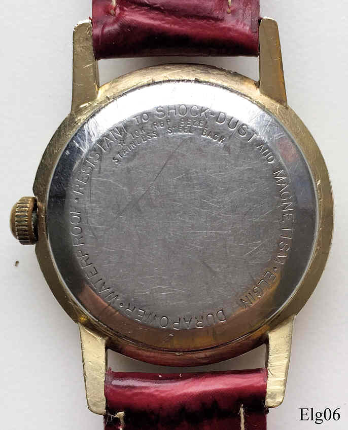 Dies ist eine Elgin Automatik Uhr mit eingelötetem Edelstahlboden und geteilter Stellwelle. Interessant auch die ungewöhnliche Unruh Konstruktion. Beschriftet vorn: ”Elgin, 27 Jewels, Selfwinding, American Made”, hinten: “Durapower, Waterproof, Resistant to Shock - Dust and Magnetism, Elgin, 10K RGP Bezel, Stainless Steel Back”, innen: “761, 27 Jewels, USA, ADJ’d”. Die Uhr hat ein geschlossenes Gehäuse und muß von der Glasseite geöffnet werden, Kaliber Elgin 761.