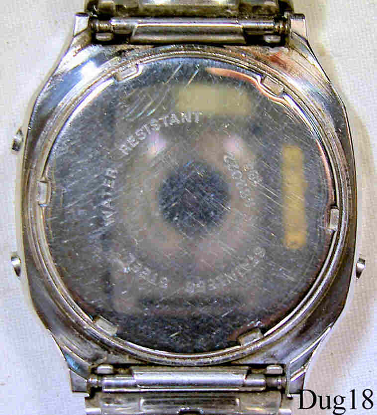 Ein Dugena LCD Alarm Chronograph mit Edelstahl Gehäuse und Stainless Steel Back. Beschriftung vorn: “Dugena, Alarm, Quartz” hinten: ”Water Resistant, Stainless Steel, 889022, 194”, innen: “NEC K84, No (0) Jewels, Unadjusted, Casio, Japan”. Alle Anzeigen erfolgen auf einem LCD Display, Uhrzeit und Wochentag gleichzeitig. Edelstahlarmband mit Dugena neutraler Schließe.