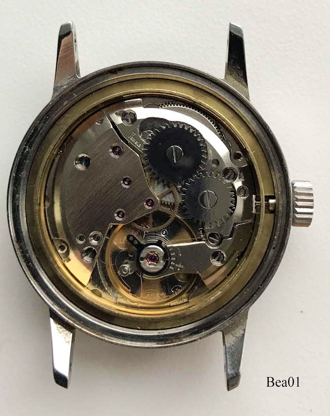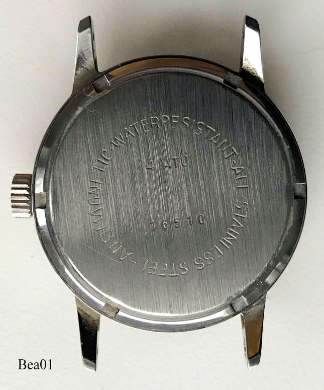 Dies ist eine Bergana Handaufzugs Uhr. Beschriftet vorn: ”Bergana, Aquarex”, hinten: “Antimagnetic, Waterresistant, All Stainless Steel, 4 ATÜ, 16510”, innen: ”ETA 2762, 17 Jewels”. Edelstahl Gehäuse mit silbernem Zifferblatt, Kalender bei der 3. Kaliber ETA 2762