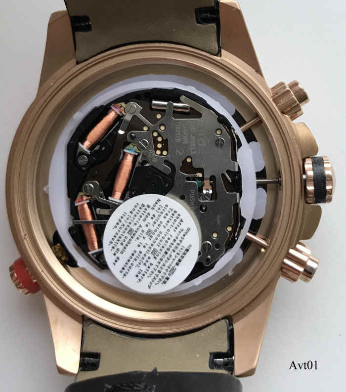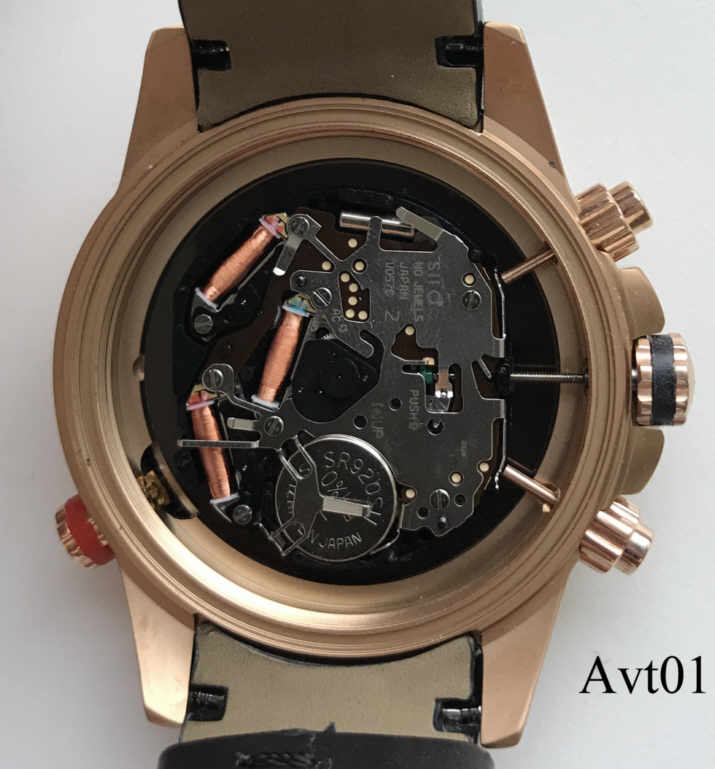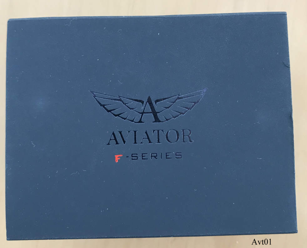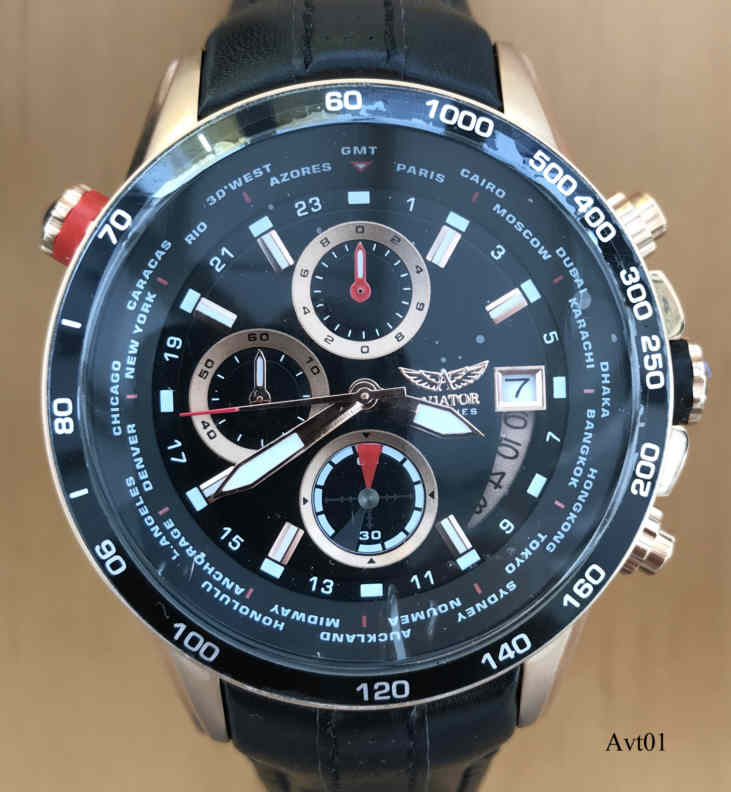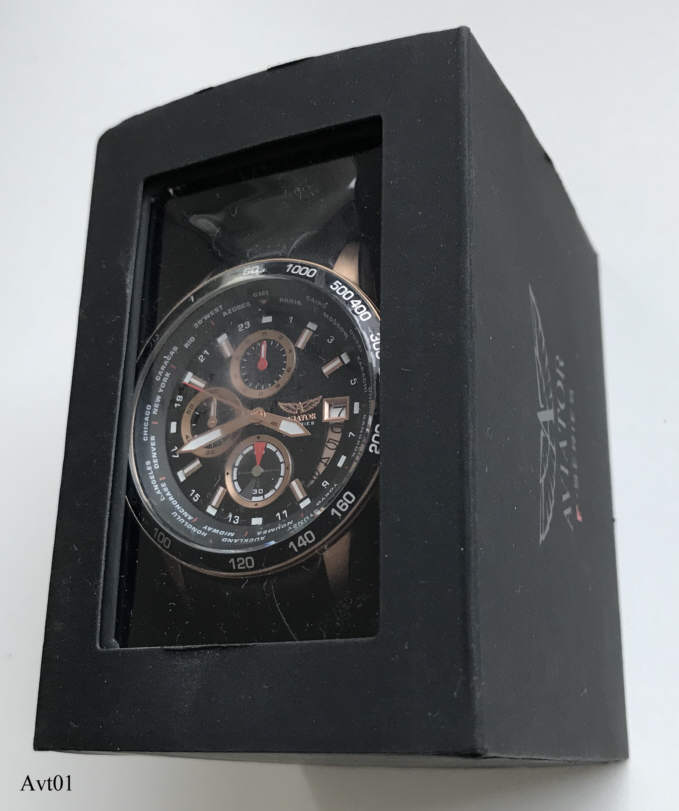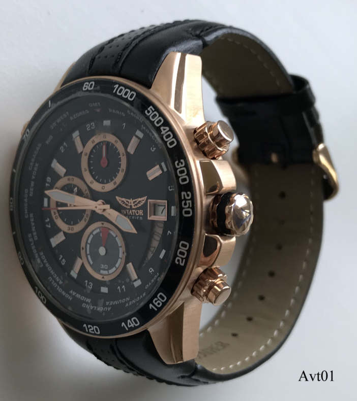 Ein Chronograph von Aviator mit Stabindexen und 24 Std. Anzeige auf dem Zifferblatt, Datum bei der 3. Beschriftet vorn: “Aviator, F-Series”, hinten: ”Aviator, F-Series, AVW8974G139, Assembled in China, All Stainless Steel, 10ATM Water Resistsant”, innen: “SIIO, No Jewels, Japan, VD570”. Tachymeterring außen, mit dem roten Knopf wird der innenliegende Städtering verstellt. Schwarzes Lederarmband