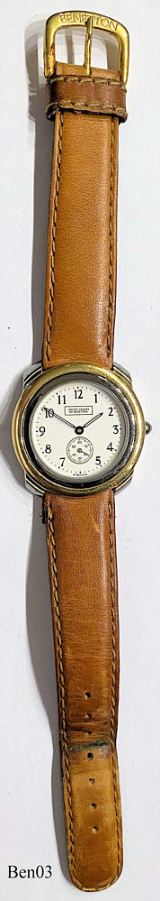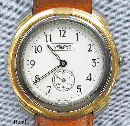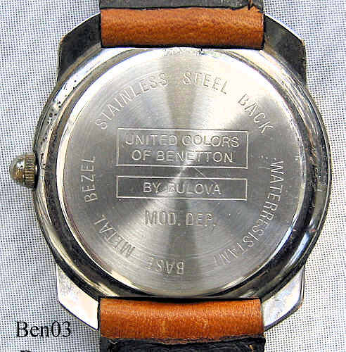 Ein Benetton by Bulova Retro Modell, Beschriftet vorn: ”United Colors of Benetton by Bulova”, hinten: ”United Colors of Benetton by Bulova, Stainless Steel Back, Water Resistant, Base Metal Bezel, Mod. Dep.”, Braunes Lederarmband mit neutraler Schließe.