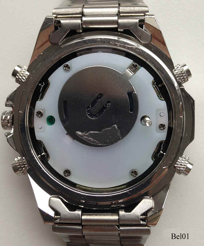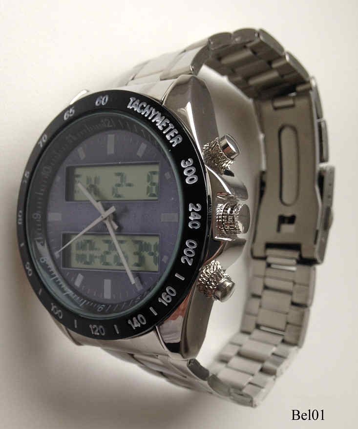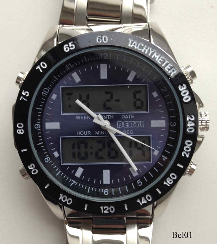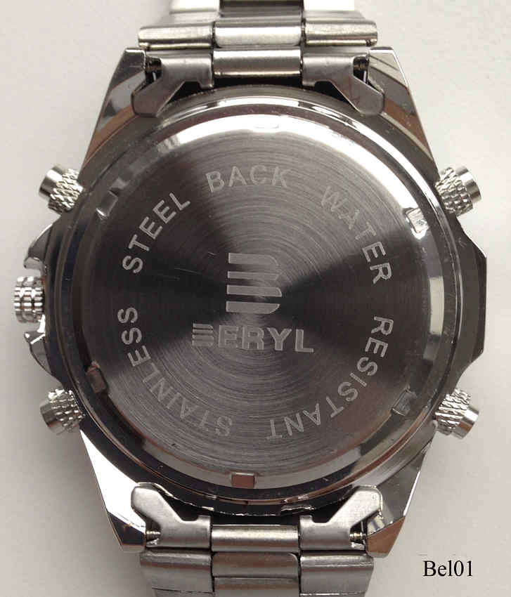 Ein Chronograph von Beryl mit zwei Digitalanzeigen im inneren Zifferblatt. Hier werden die Chronofunktionen angezeigt, außen ist nur die Analoge Zeitanzeige. Beschriftet vorn: “Beryl”, hinten: ”Beryl, Stainless Steel Back, Water Resistant”, innen: “”. Edelstahl Gliederarmband