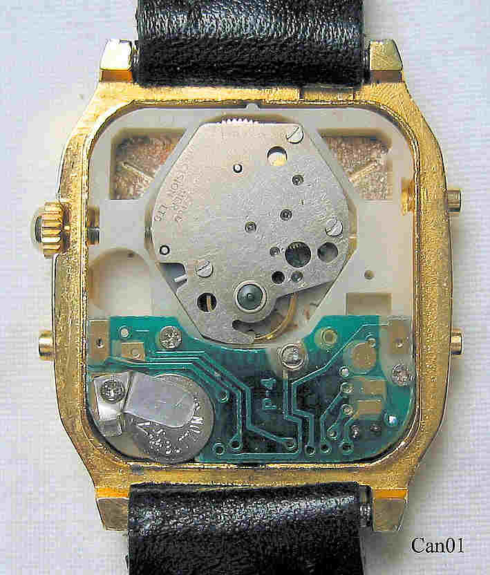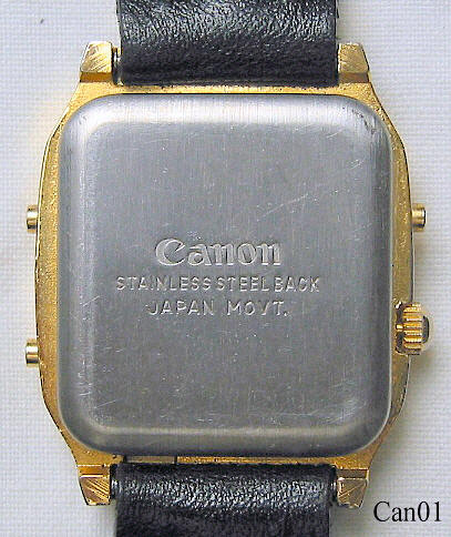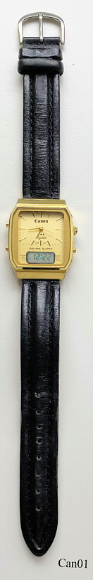 Diese Canon Armbanduhr ist eine Besonderheit, weil hier eine mechanische Handaufzugs (!) Analoguhr mit einer digitalen Quartz Uhr in einem Gehäuse vereinigt ist. Außerdem ist Canon als Uhrenhersteller nicht sehr bekannt. Beschriftet: ”Canon, Crystal, Digi Ana Quartz” Rückseite: ”Canon, Stainless Steel Back, Japan Movement”, innen: ”Unadjusted, Premier, Precision LTD,. No (0) Jewels, HongKong, Japanese Parts”. Gehäuse Base Metal, schwarzes Lederarmband.