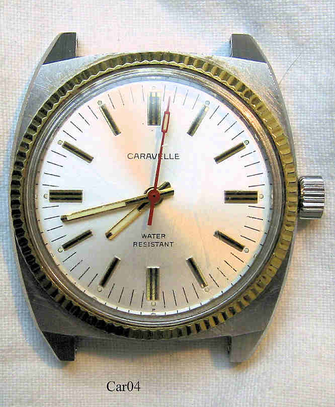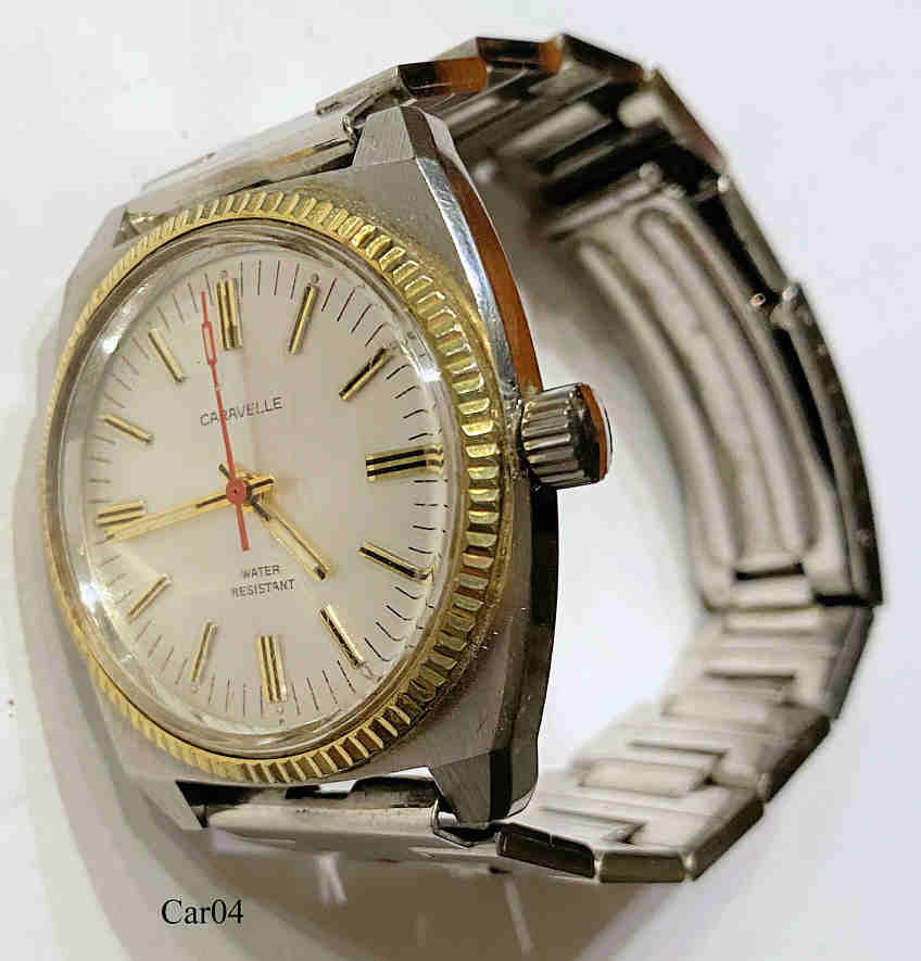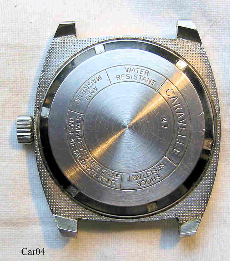 Dies ist eine Bulova Caravelle Handaufzugs Uhr, Beschriftet vorn: “Caravelle, Water Resistant”, innen: “11DP, seventeen 17 Jewels”, hinten: ”Caravelle, Shock Resistant, Water Resistant, Antimegnetic, Stainless Steel case, Base Metal Bezel Ring, N7”. Herstellung 1977 (N7).