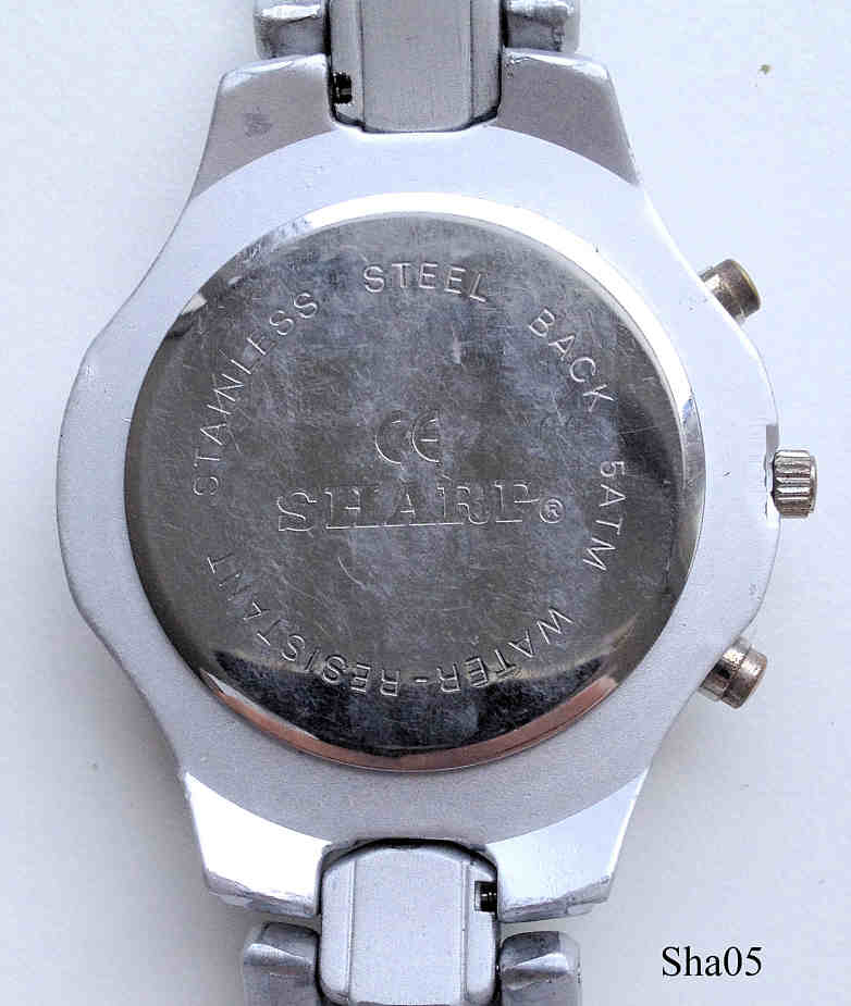 Ein Sharp Chronograph mit sehr leichtem (Alu?) Gehäuse und Stainless Steel Back. Schwarzes Zifferblatt mit silbernen Chronoskalen. Datum bei der 3, Beschriftung vorn: ”Sharp, Chronograph”, Rückseite: ”CE, Sharp, 5 ATM, Water Resistant, Stainless Steel Back”, innen: “SIIO, No Jewels, Japan, VD57B”. Kaliber SIIO VD57B, leichtes Metall Gliederarmband