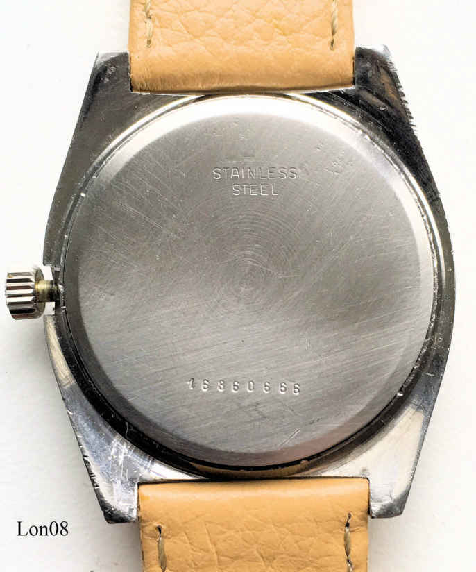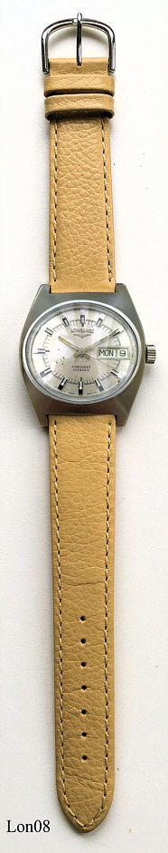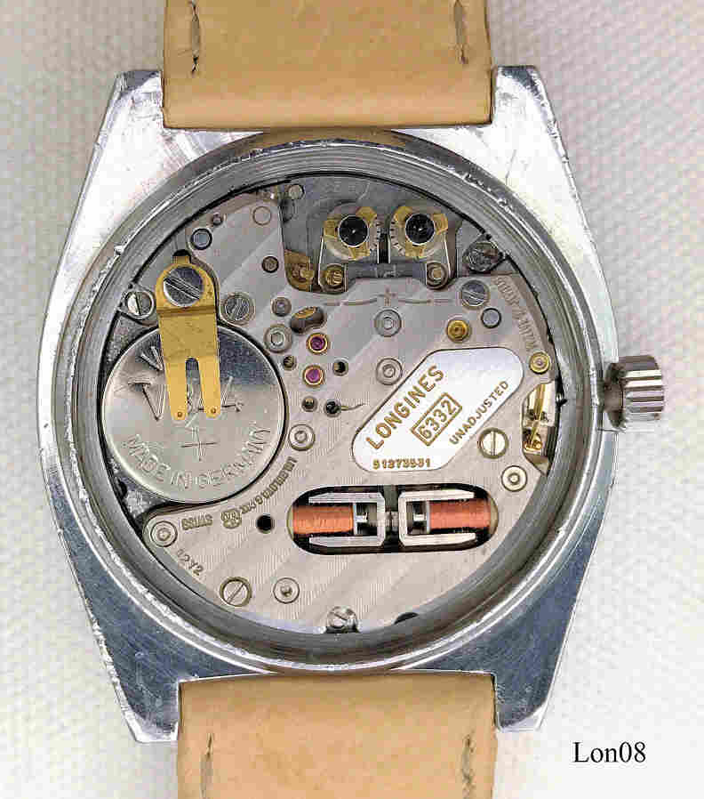 Dies ist eine Longines Conquest, Werk N° 51273531, Caliber 6332, ESA 9164, Edelstahl Gehäuse, geklemmter Edelstahlboden. Beschriftet vorn: ”Longines, Conquest, Ultronic”, hinten: ”Stainless Steel, 16860666”, innen: “Longines, 6332, 51273531, unadjusted, Twelve 12 Jewels”